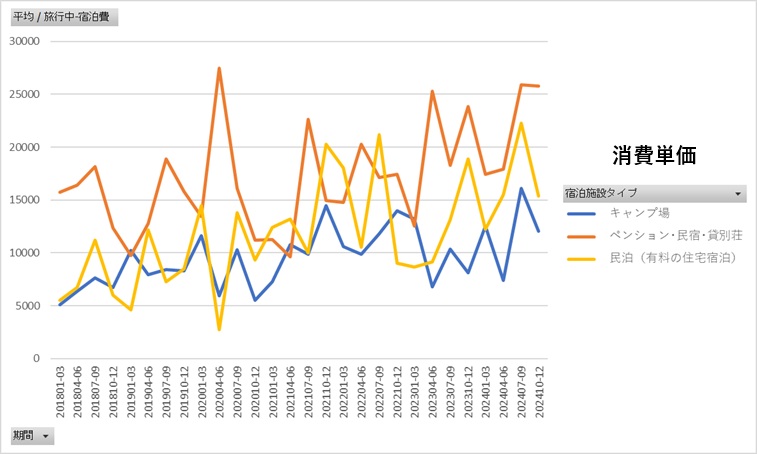 統計期間によってデータのばらつきが大きく、あまりこれといった傾向は見て取れません。しかし、キャンプ場含めたどの業態も2021年を境にやや高単価にシフトしていると言えます。これは昨今のインバウンド需要によるホテル宿泊費の高騰を受け、宿泊業界全体として宿泊費が底上げされている可能性が考えられます。