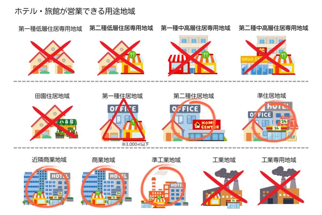 ホテルや旅館の営業できる地域は限られており、どこでも営業できるわけではありません。特に住宅街などは開業が不可な場合が多いです。